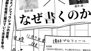 フィクション×ノンフィクションの交差 フィクションとノンフィクション、取材と批評、分野をまたいで「書く」ことを仕事にしている教員(藤井 誠二、松田樹)の経験や経緯を公開するためのシンポジウム。創造表現学部の学生たちの創作 … 続きを読む 創造表現学会学生企画「私たちはなぜ書くのか」開催のお知らせ