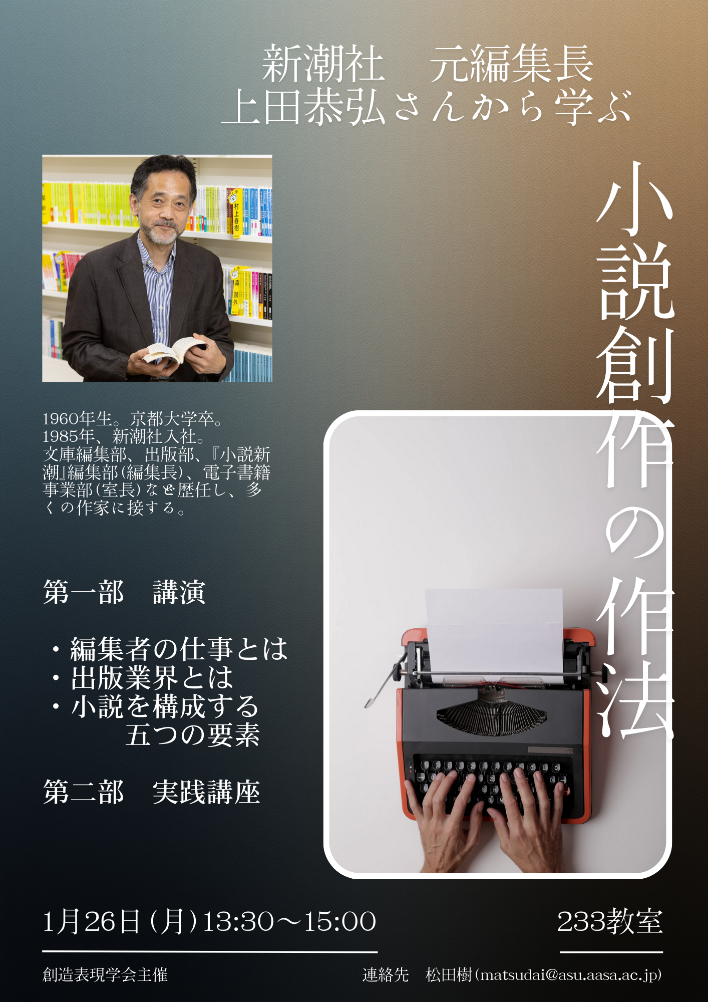 新潮社の元編集長・上田恭弘さんをお招きして出版業界のこと、編集者の仕事、創作と働くことのバランスなど、お話しいただきます。授業時間と重ならない催しなので、フラッと聞きにくるだけでもOKです。ぜひご参加ください。