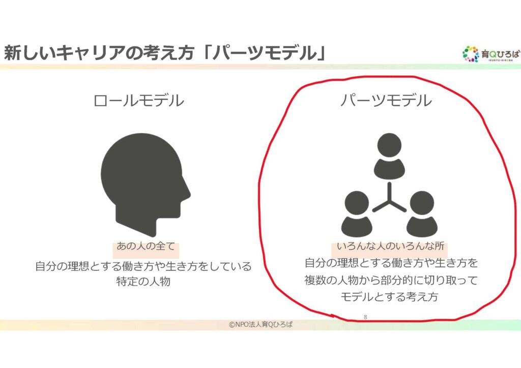 パーツモデルは、ロールモデルのように特定の相手の生き方すべてを参考にするのではなく、複数の人物の良いと思われるところをそれぞれ部分的にモデルにするという考え方です。