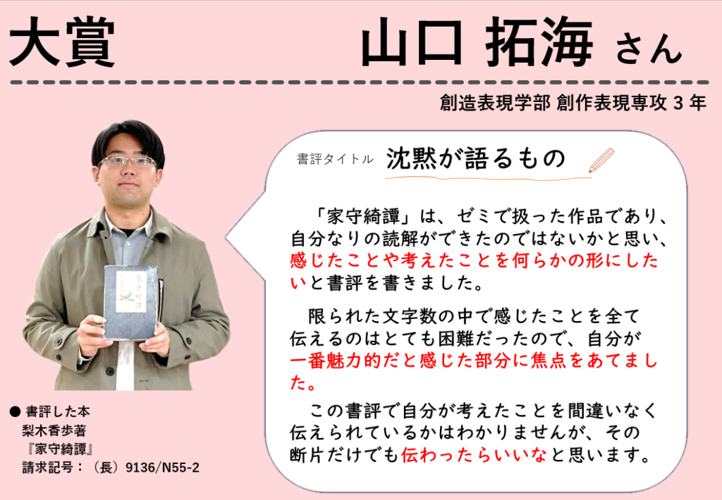 創作表現専攻・3年生の山口拓海さんが図書館〈書評〉大賞の大賞を受賞しました。書評大賞への応募は今回2回目で、1回目は惜しくも受賞にはいたらなかったそうですが、今回大賞を受賞し、見事リベンジを果たしました。山口さんに書評を書くために工夫したこと等、お話を聞きました。