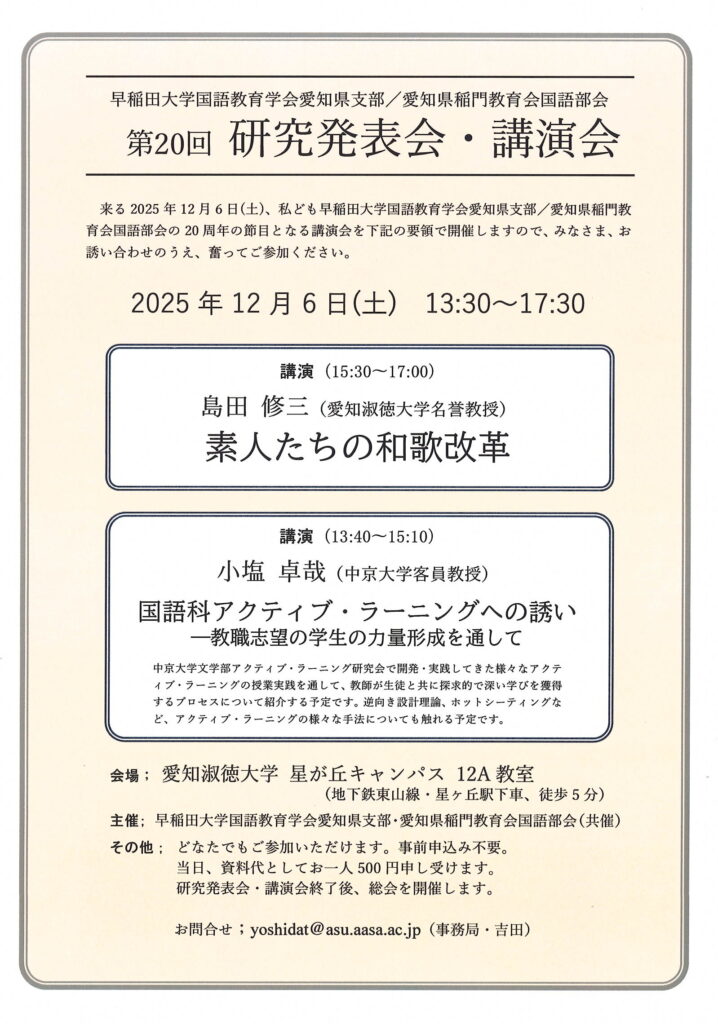 愛知淑徳大学 名誉教授・島田修三氏による講演会のお知らせ