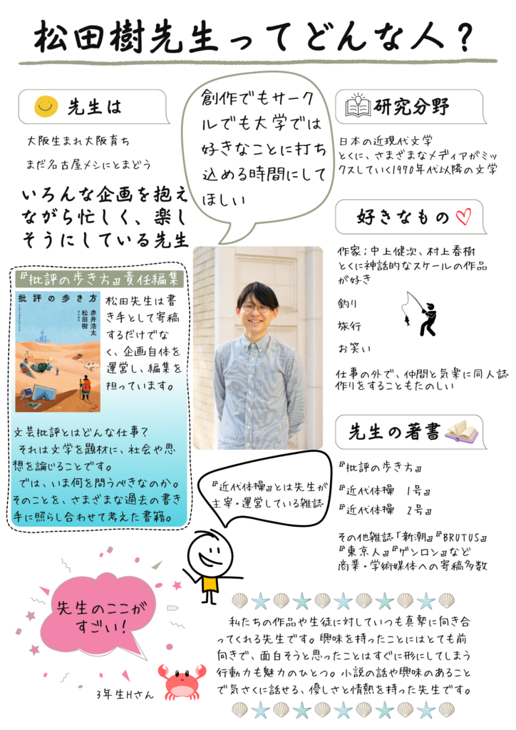 しかし、今の時代でも、本当に「文学」をしようとするならば、書くという行為はそのようなものであるはずです。自身の核になるテーマを探し、それを表現に結びつけていくこと。そして、それが逆に、よりよく生きることに繋がってゆくこと。そのような書き、考え、生きることのサポートができればと考えています。