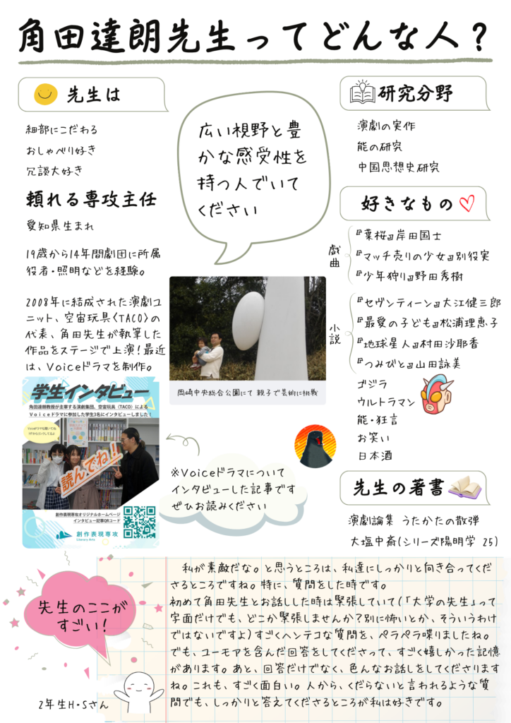 私がゼミ等で担当するのは演劇ですが、演劇に限らず映画・マンガ等、視聴覚表現全般に関心を持っています。それぞれのジャンルの特性について考えたり、そもそも人から人へ何かを表現し伝達することはなぜ可能なのかと原理的に掘り下げたりするのが好きです。そんな関心を共有できる皆さんと出会えることを楽しみにしています。