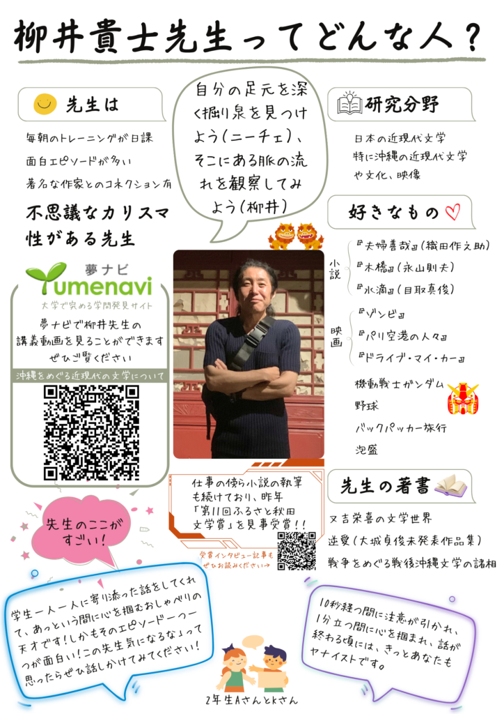 自分の存在という一点を見つめてみると、そこからいろいろな関係(故郷、親子、友人、恋人…)、感情や思いが広がっていくでしょう。「愛、希望、自由、夢、足元をごらんよ、きっと転がってるさ」と先人も言っています。自分の足元を深く掘り泉を見つけよう(ニーチェ)、そこにある脈の流れを観察してみよう(柳井)。きっといろいろな物語に、あなたとつながる大切な物語に、出会えるでしょう。そこには「自分」以外との関係が必ずあります。「他者」、それは自分とは違うものを持った存在、その多様性に対していろいろ考えをめぐらせることで、自分が「深く」なるのでしょう。自分の存在と切れたところに生まれた言葉は表層を埋めるだけ。創作も文学研究も評論も、まずは「自分」と向き合うところから始め、多様な「他者」に接してほしいと思います。その手助けをしていきます。