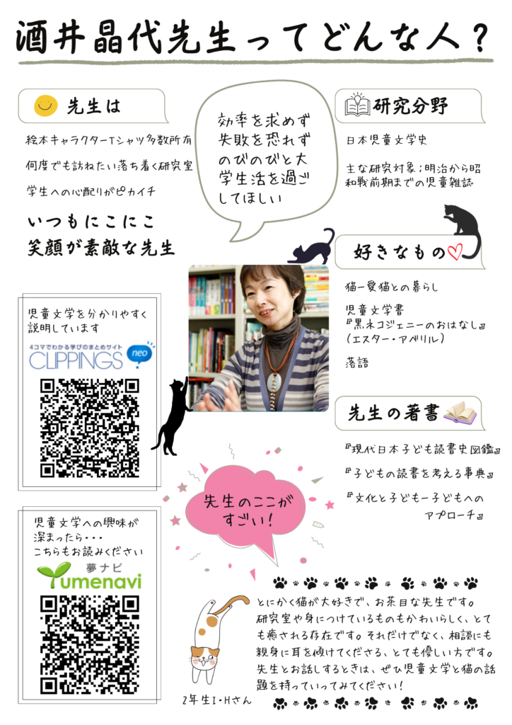 専攻は日本児童文学史。明治から昭和戦前期までの児童雑誌を主な研究対象としてきました。近年はこれに加えて、企業が実施した児童文化事業、具体的にはおまけや懸賞の賞品、またそれらに付随するイベントなどを児童文化史の中に位置づけようと日々模索中です。このほか、仲間と一緒に幼年童話のブックリストを作ったり、絵本史の単行本に論文を書いたり、雑誌で子ども文化時評を担当するなど、広く子ども文化や文化史の視座から児童文学を捉えなおすことに関心があります。