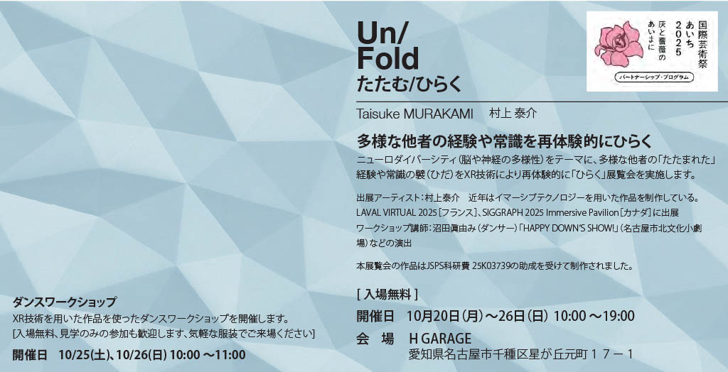 地域のコミュニティガレージとして星が丘に誕生したH GARAGEにおいて、ニューロダイバーシティ(脳や神経の多様性)をテーマに、多様な他者の「たたまれた」経験や常識の襞(ひだ)を、XR技術により再体験的に「ひらく」展覧会を実施します。